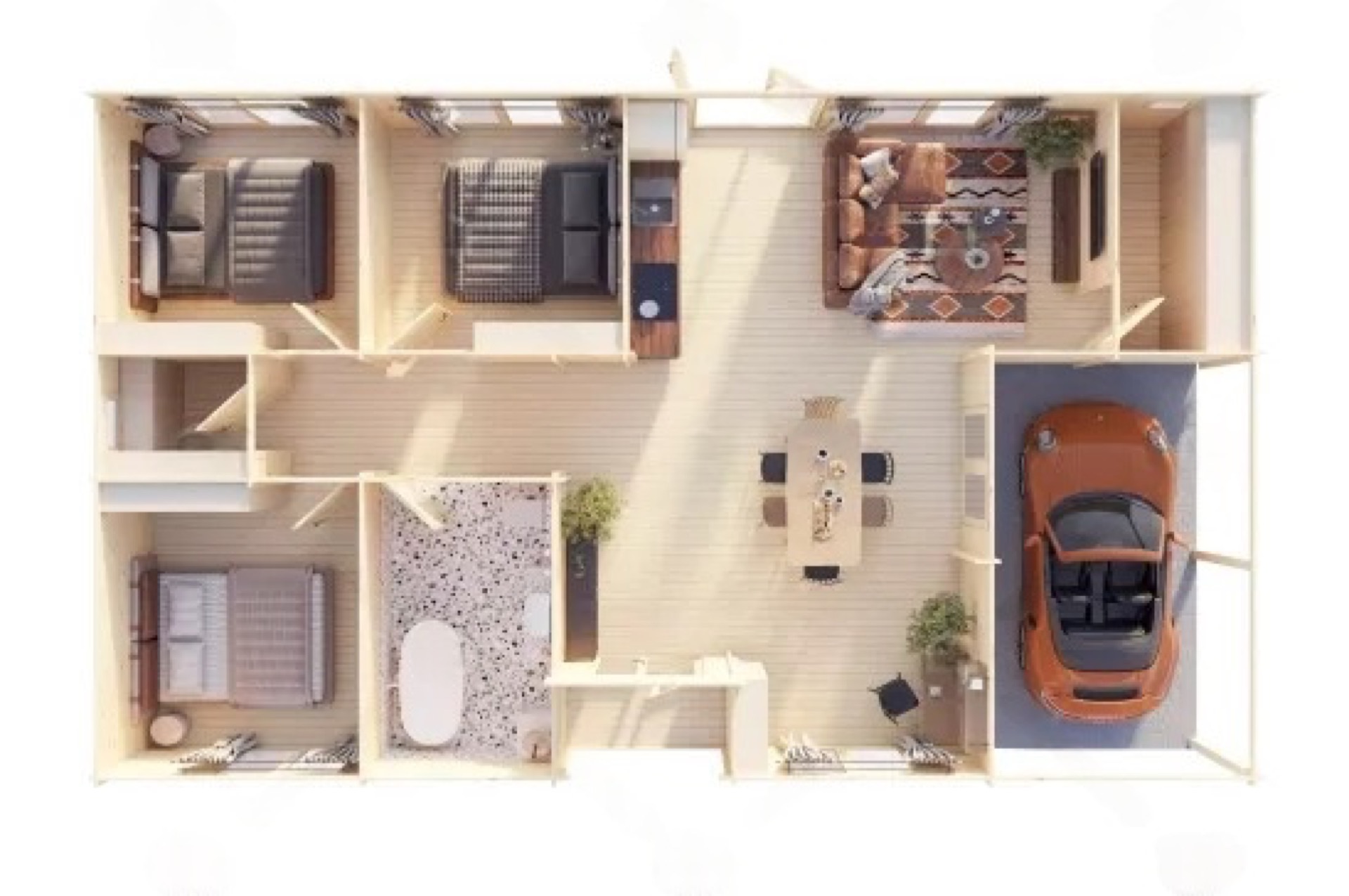 Casa izolată din lemn CORTINA 125 m² cu 3 dormitoare + garaj